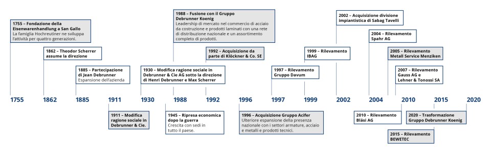 Il Gruppo Debrunner Koenig fu fondato a San Gallo nel 1755 con il nome di Hochreutinersche Eisenwarenhandlung. Jean Debrunner subentrò nel 1885, espanse l'azienda e nel 1911 cambiò la ragione sociale in Debrunner & Cie. Le conseguenze della prima guerra mondiale e lo scoppio della seconda guerra mondiale misero la nuova società per azioni a dura prova.
